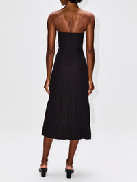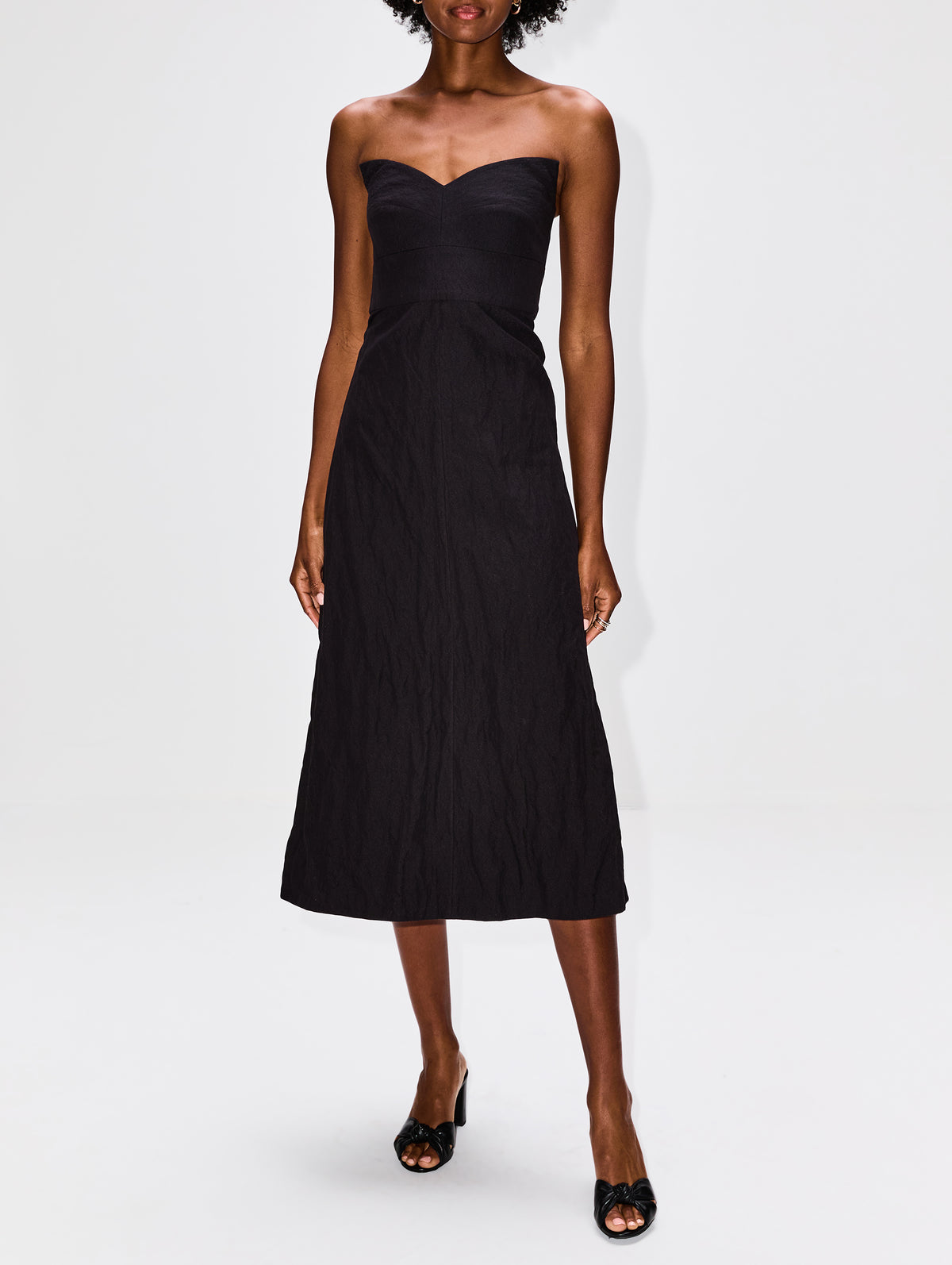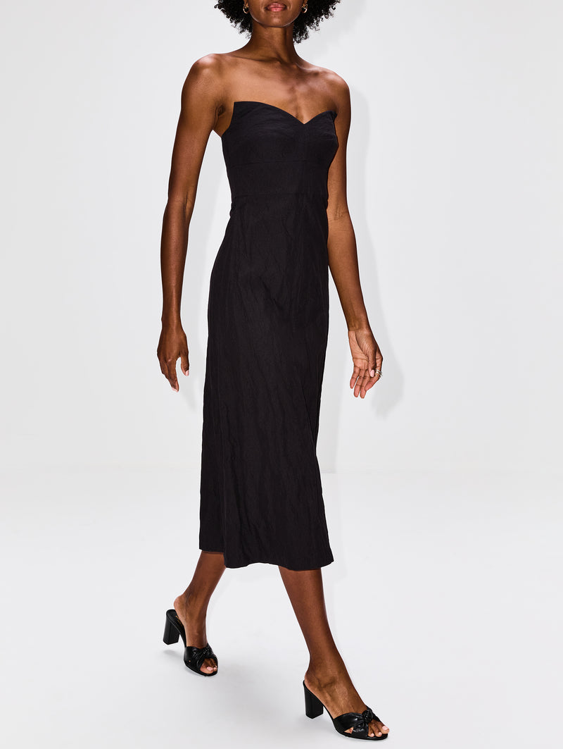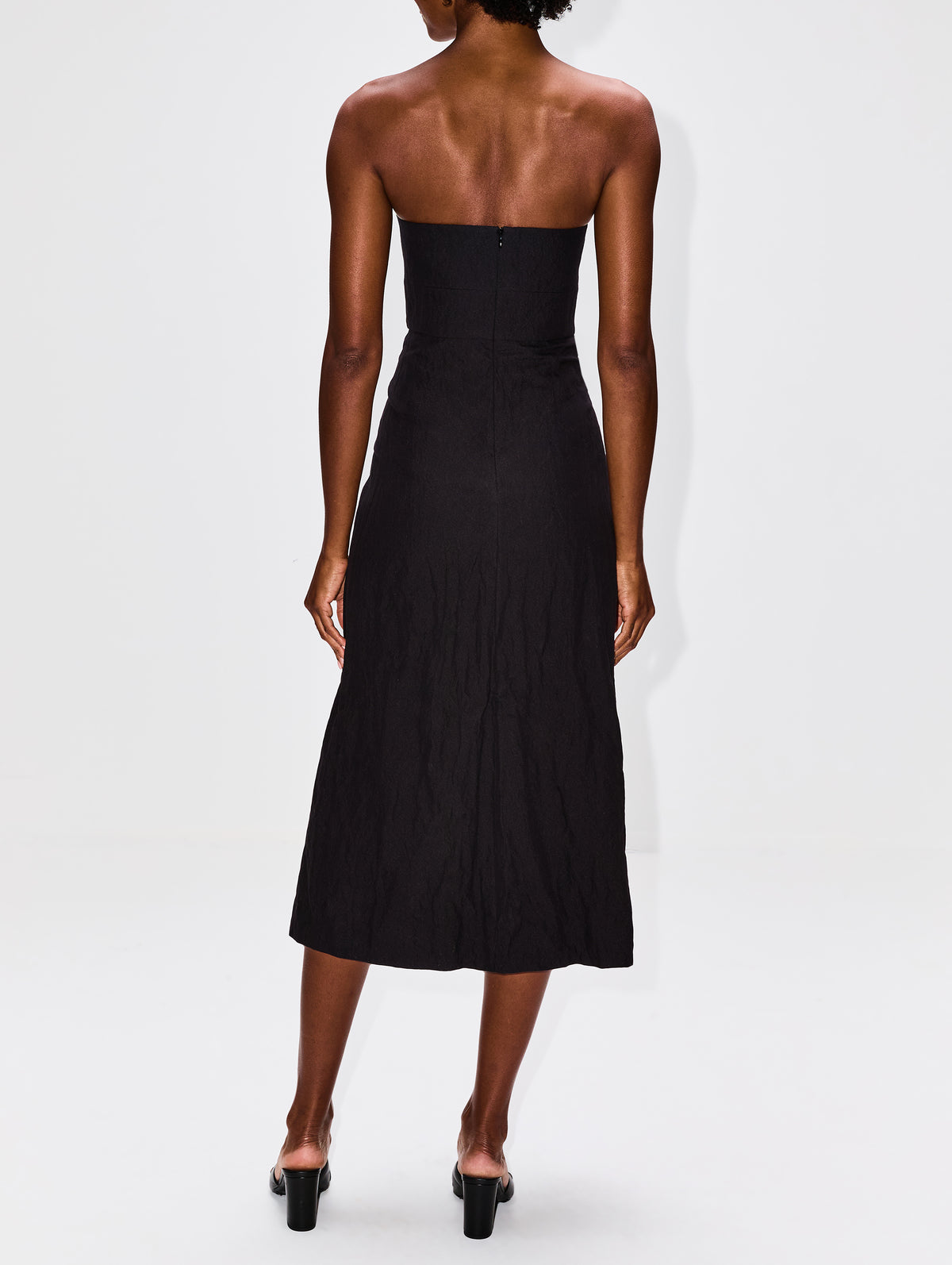 The Baxter is made with a sculptural strapless fit, created by details from the angled neckline to the delicate crinkled fabric and slightly flared midi length.