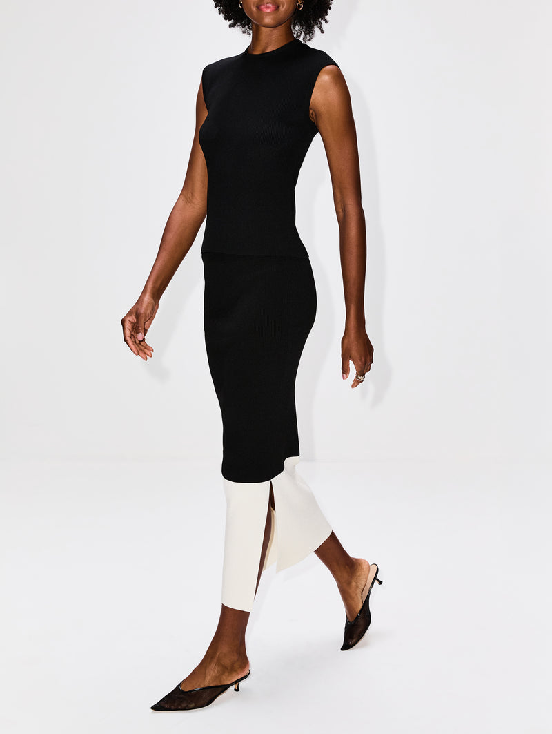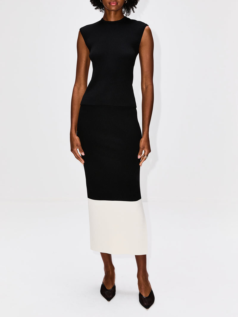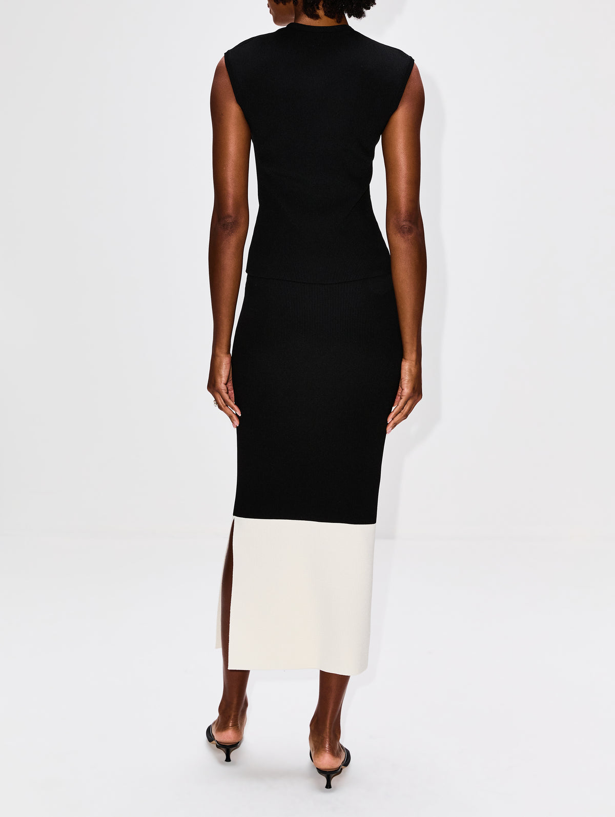 This two-tone skirt showcases elegant side slit detailing, adding a touch of sophistication and flair to your outfit along with its comfortable elastic waistband.