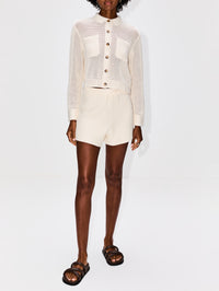 This woven short is perfect for sunny days with its cropped length, refined trim and luxurious crochet texture.