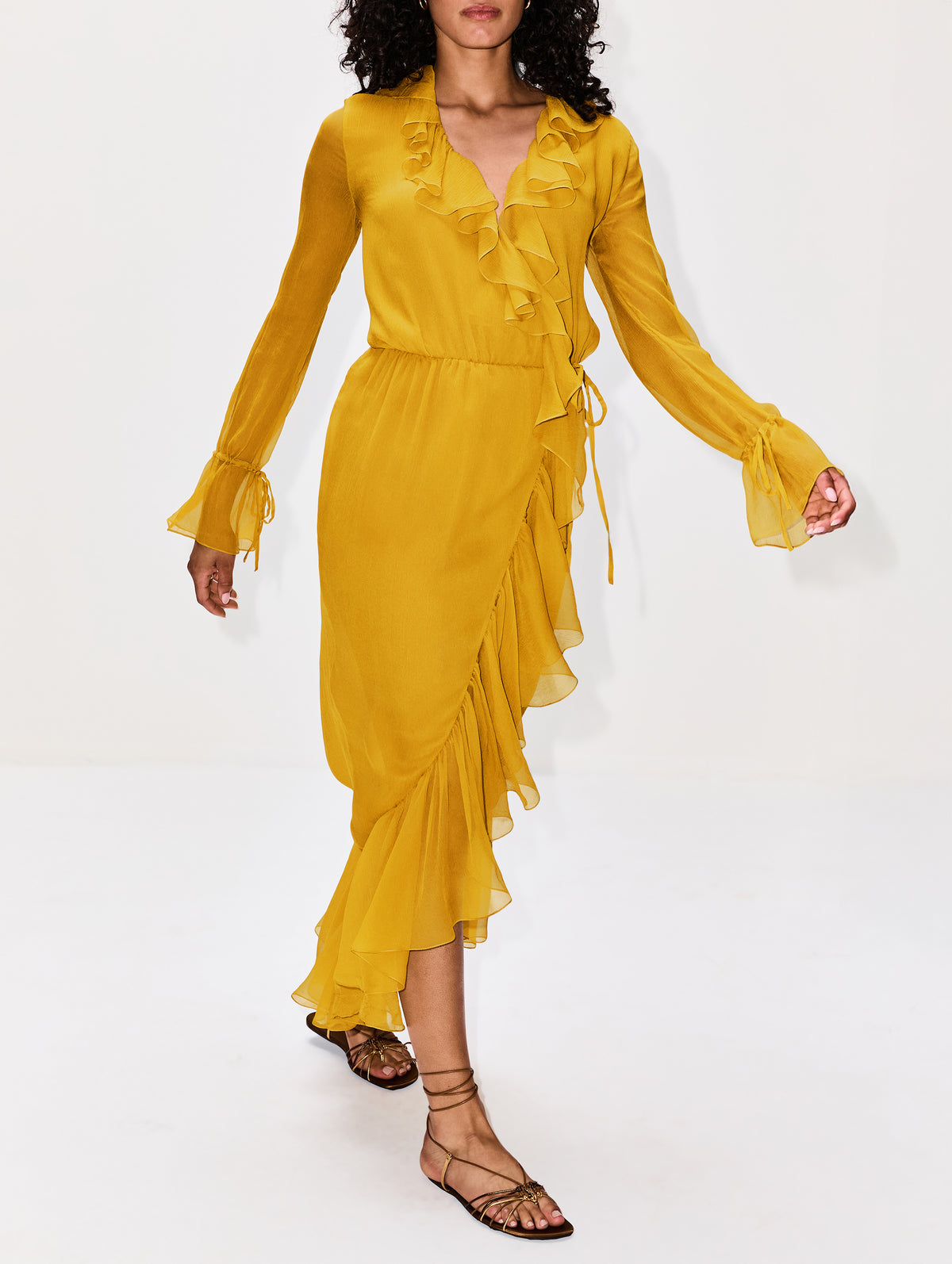 This semi-sheer long wrap dress is shaped with a cinched waist, drawstring poet sleeves, and ruffled trims for a romantic and vibrant styling piece.