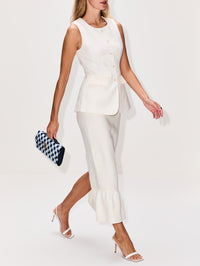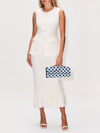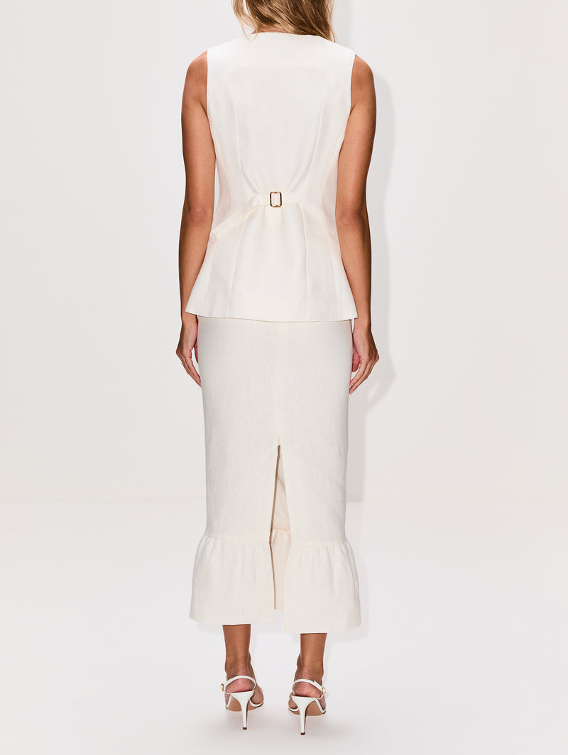 The Matilda Column Skirt is crafted from a sleek linen finish with a frilled maxi hem, creating the perfect pairing with the designer's matching gilet.