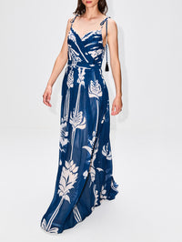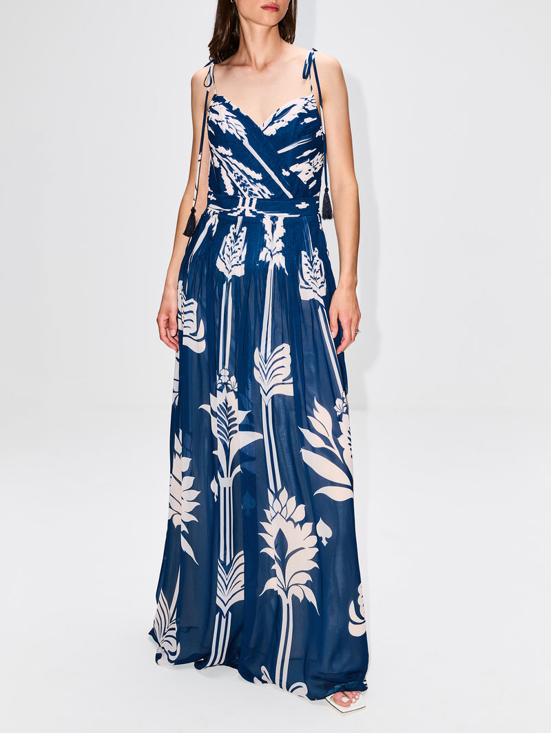 The Aarkid Dress cascades to a maxi hem, flowing from a fitted bust and a beautifully draped floral skirt. Adorned with tie straps that are embellished with charming tassel details, this dress promises to be a stunning addition to any wardrobe.