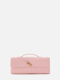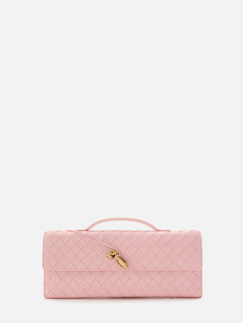 Bottega Veneta's Andiamo clutch utilizes the label's signature intrecciato leather to weave together an elongated structure, a single structured handle and a gold-toned knot charm that ties the piece together. Andiamo in style!