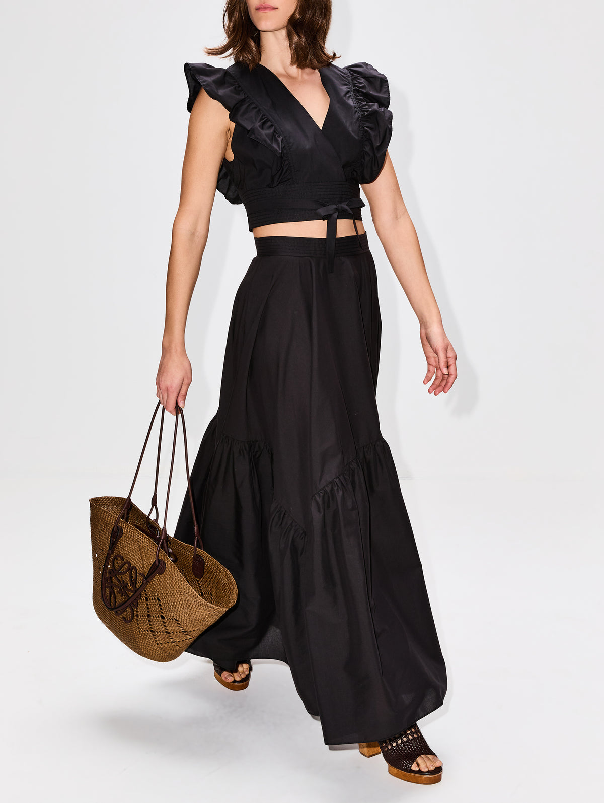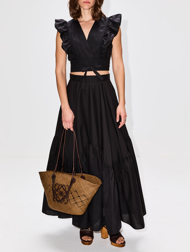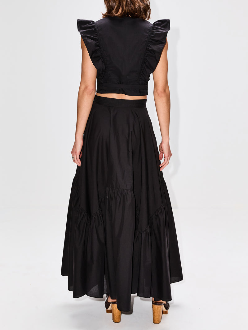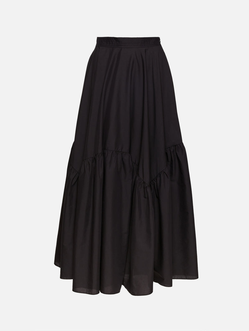 The Astree features a flared maxi cut with gathered details that add a feminine touch.