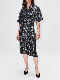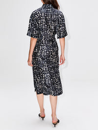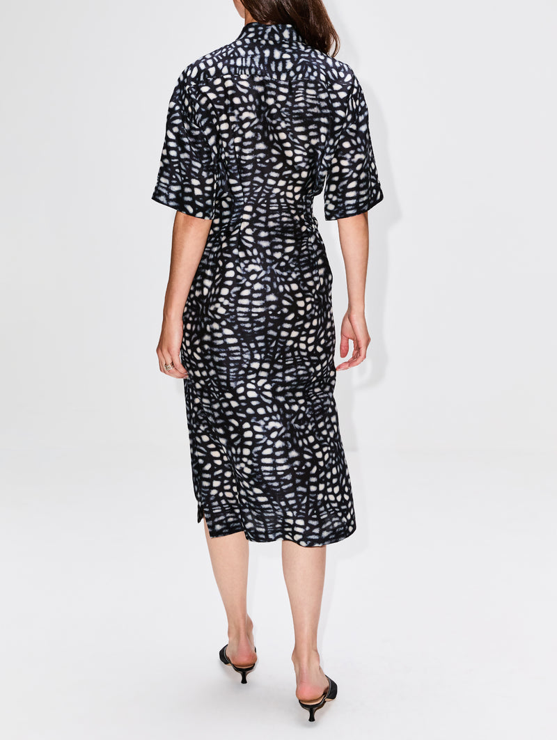 This draped shirtdress design and midi length are as artful as its allover print. The modern silhouette is enhanced by intricate ties that give shape to the flowing fit.