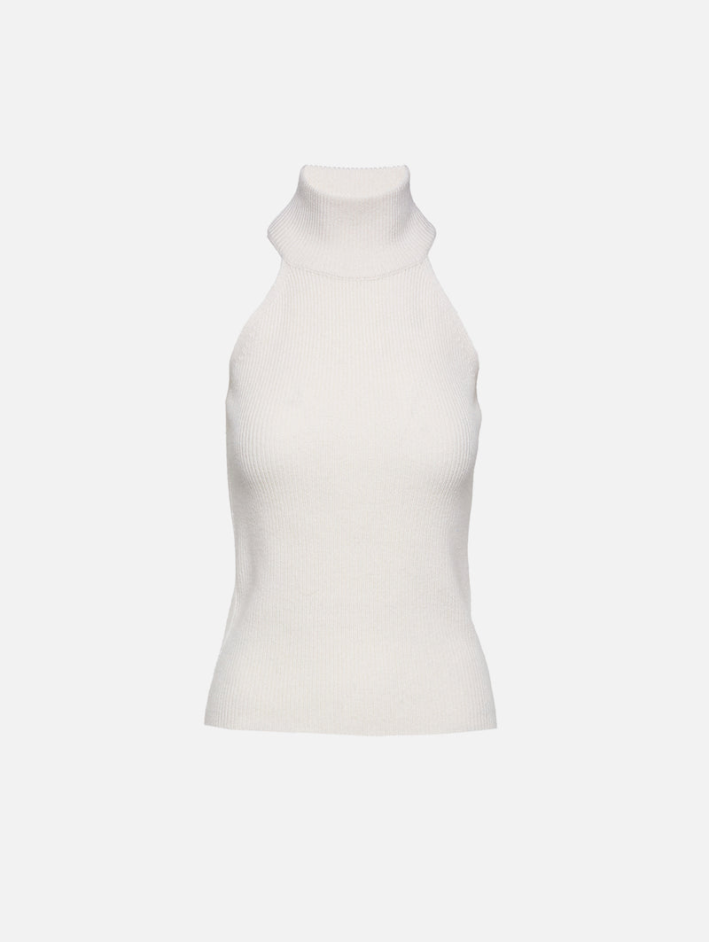 The Freya Tank features a fitted silhouette with curved armholes for a flattering look and a straight hemline for versatility. Perfect for wearing alone in spring or layering with cashmere in cooler seasons to highlight its chic high neck. A wardrobe essential!