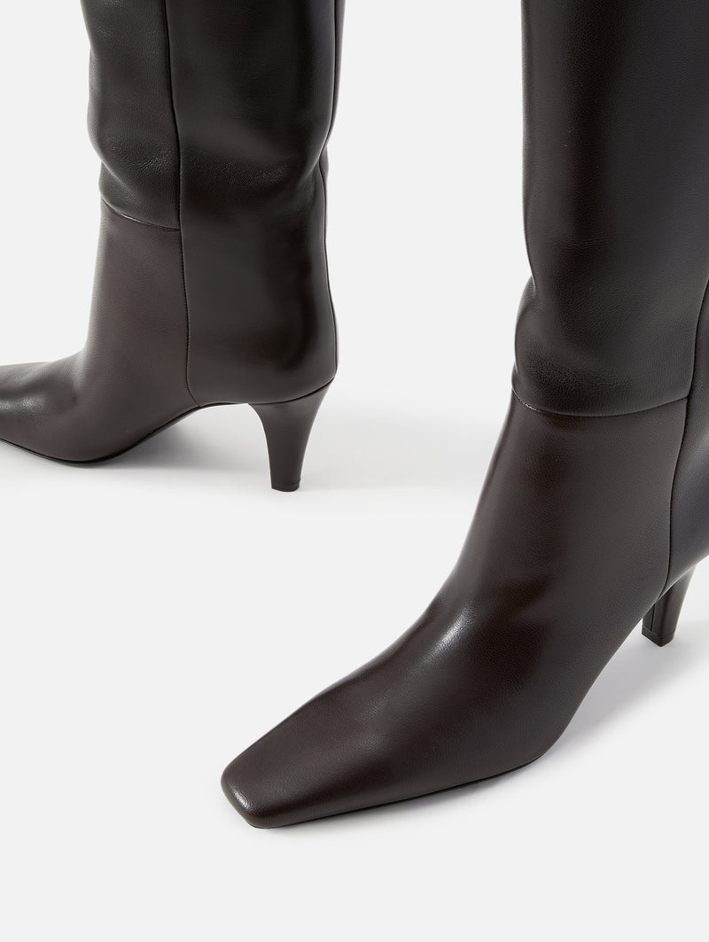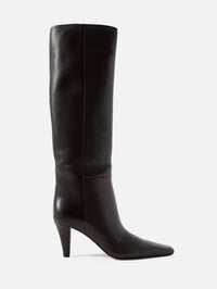 The Jill Boot is a sleek black boot crafted from lambskin. With a slip-on style and a pointed toe, it features a 75mm stacked heel for elegance. The branded leather insole and leather sole ensure both comfort and sophistication. Perfect for elevating any outfit!