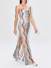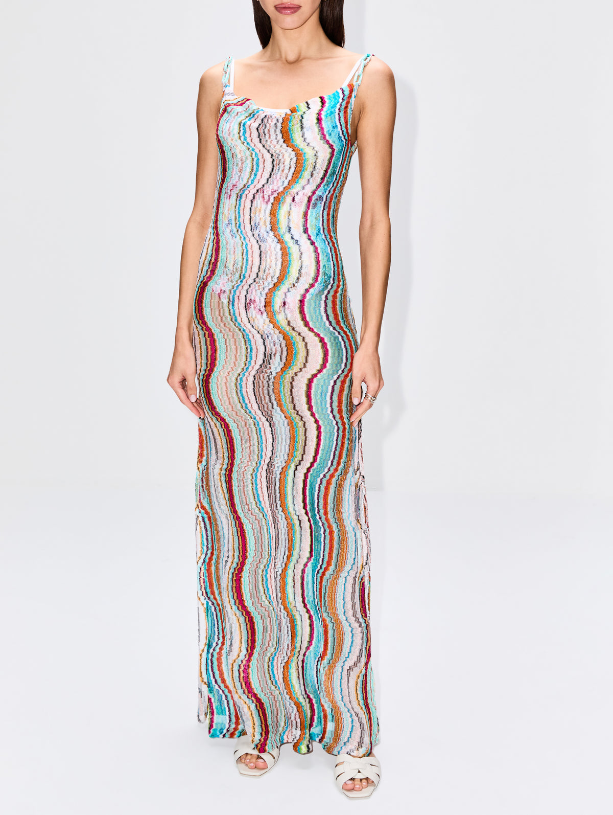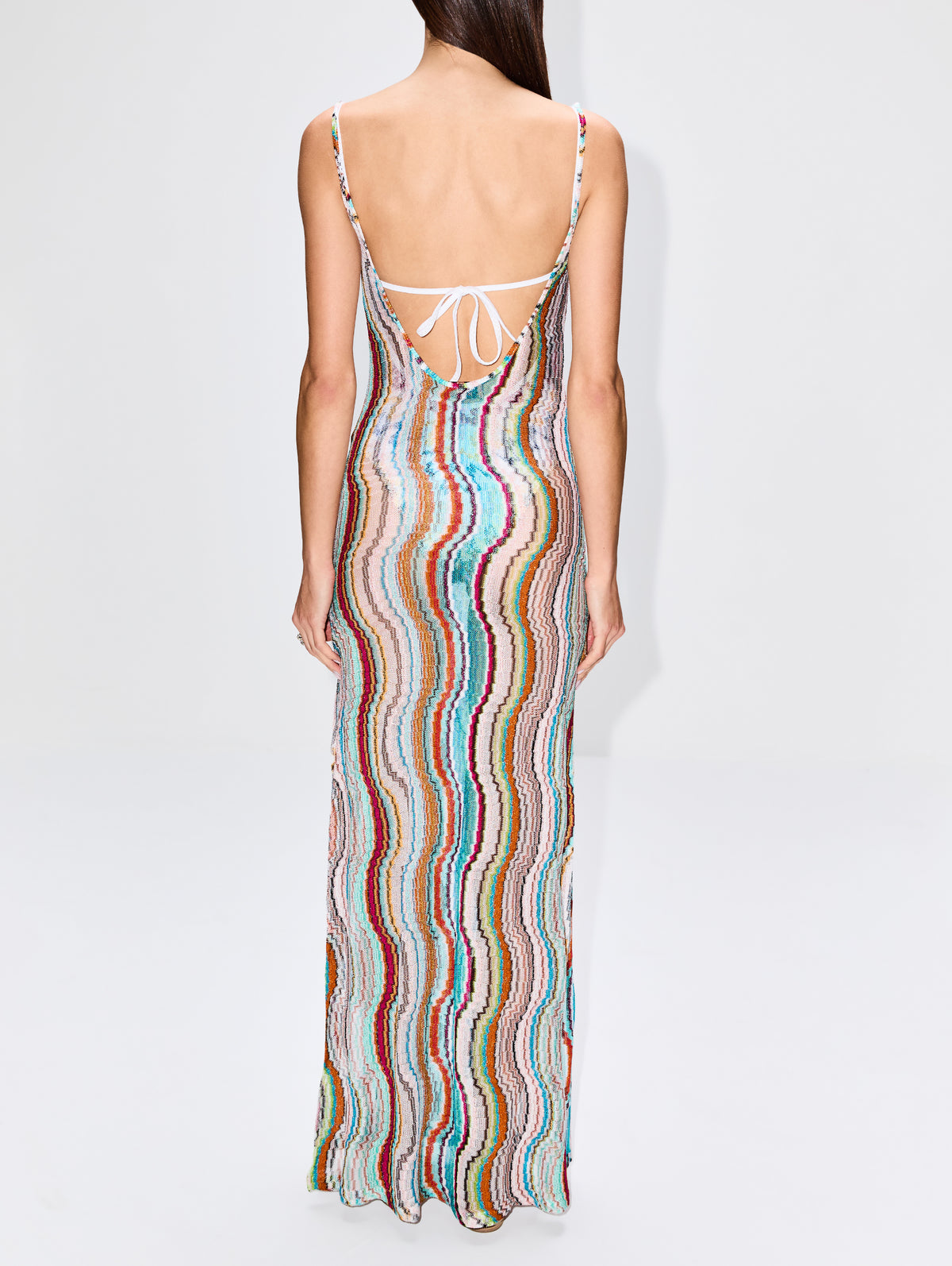 The Long Cover Up features a vibrant zigzag pattern in lively hues, crafted from printed tulle. This sleeveless dress offers a sleek, sophisticated silhouette, adding a pop of color and style to complete your beach look.