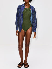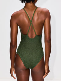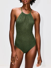 The Portia Swimsuit offers a more sport inspired fit with a high neck, angled bodice and cross back straps— all in the designer's luxurious crinkle fabric.