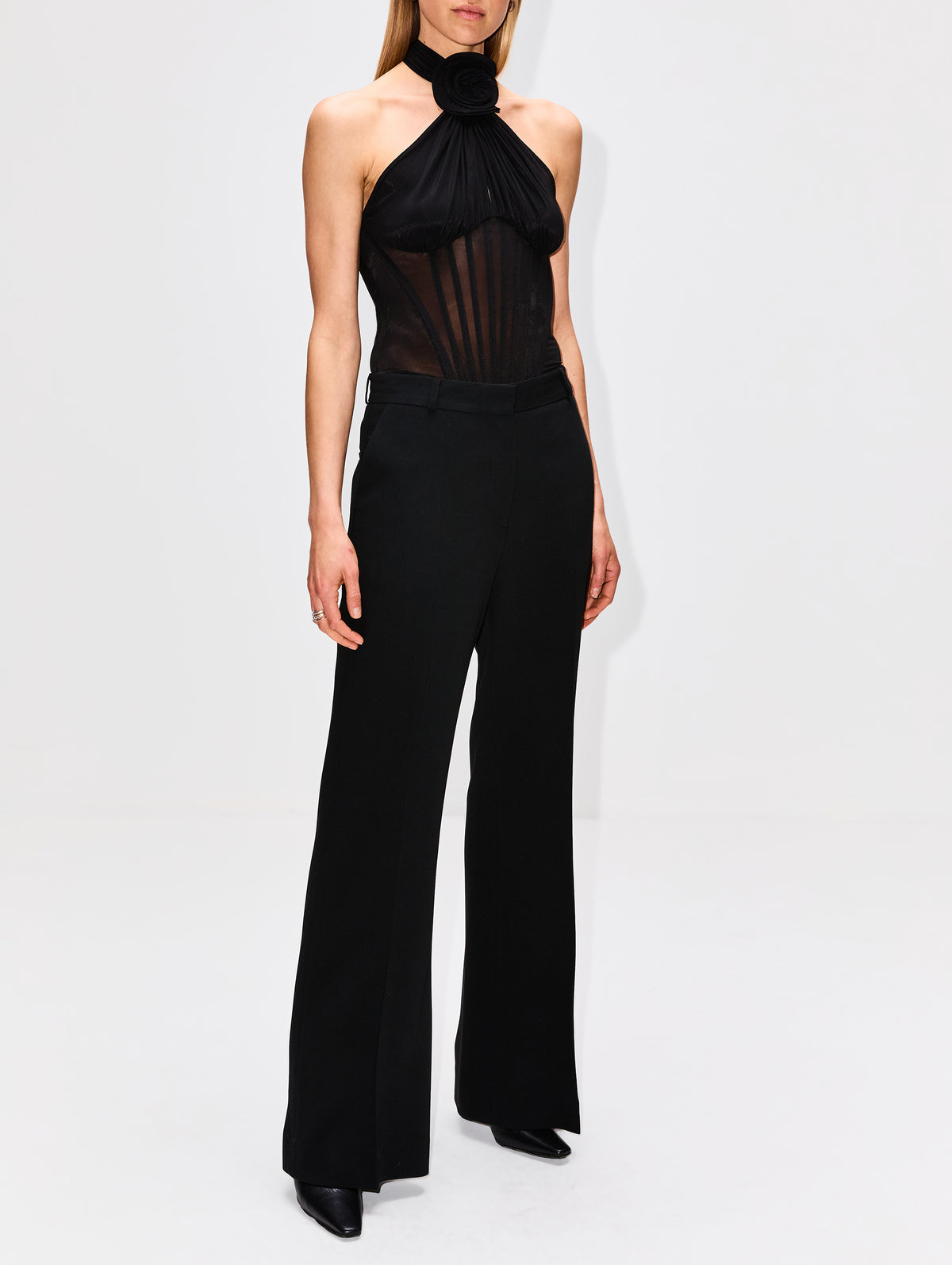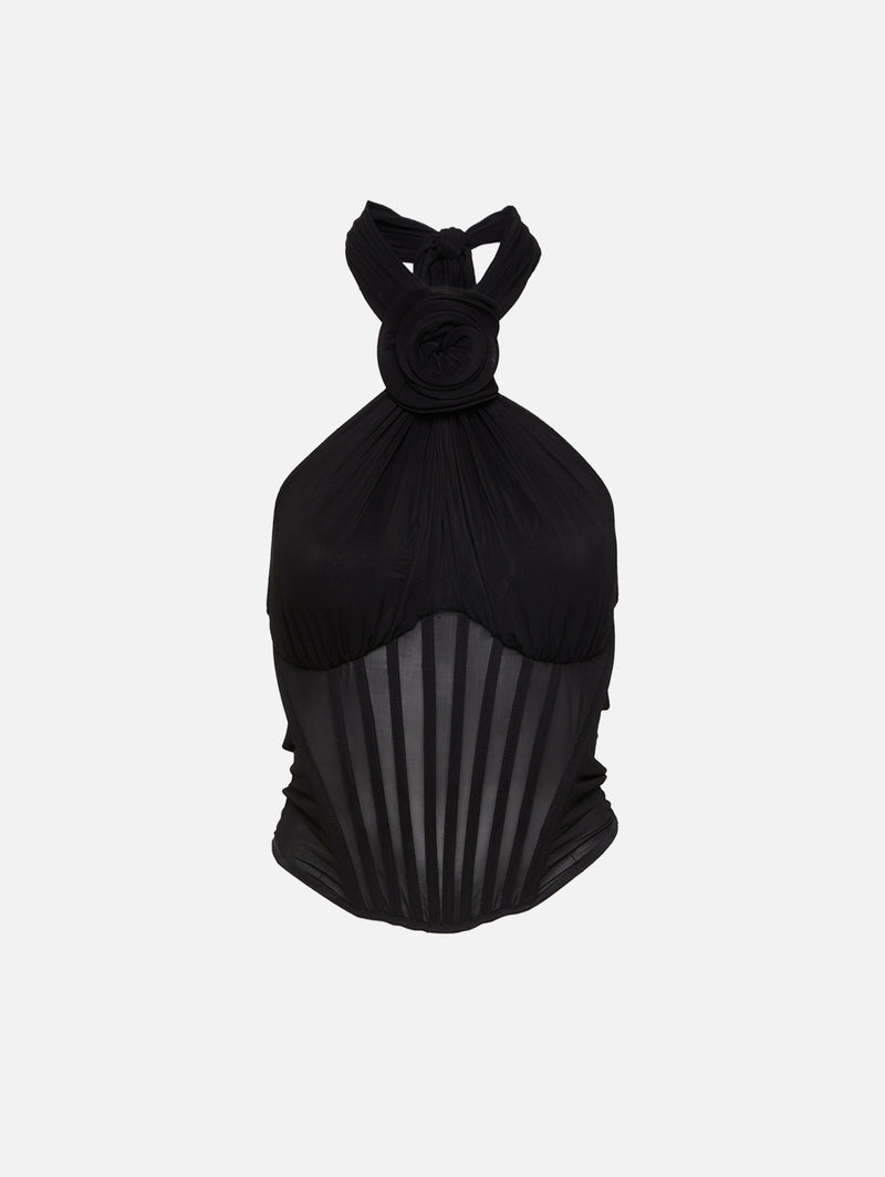 This piece offers feminine allure in a corset-inspired design overlaying floral appliqué and gathered detailing.