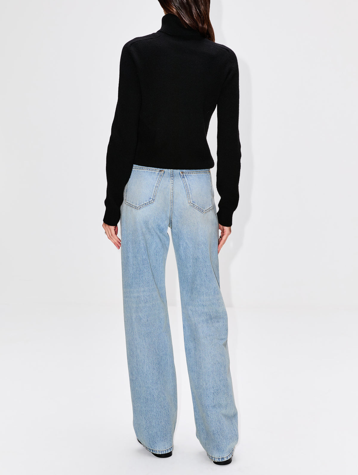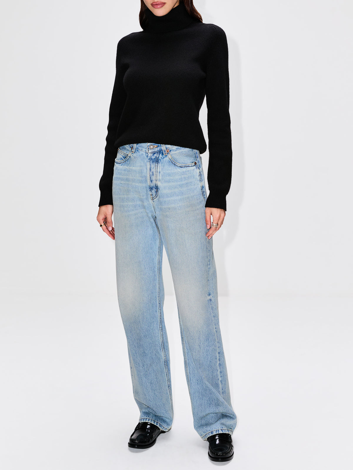 For a sleek SAINT LAURENT addition to your everyday styling, this wide-leg jean features an angled V waist. The light blue wash and soft finish highlight the silhouette's effortless yet elevated design.